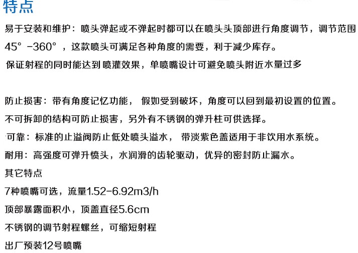 噴頭彈起或不彈起時都可以在噴頭頂部進行角度調節,調節范圍45°-360°,這款噴頭可滿足各種角度的需要,利于減少庫存。