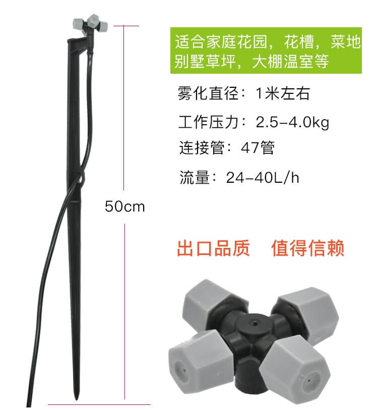 性能特點:噴頭完全引進(jìn)以色列技術(shù),設(shè)計采用一種渦流噴嘴,提供渦流噴霧流,限度地降低堵塞的可能性。霧化效果良好,配合防滴器,有效***停噴后的滴漏傷苗現(xiàn)象;分解式構(gòu)造,便于維修,可使用四出口或單出口噴頭。主要用途:倒置安裝時于適當(dāng)位置,用于溫室大棚中扦插育苗,以及溫度控制。工程造價相對較低。用于溫室或家禽飼養(yǎng)場的溫度控制。四出口霧化噴頭技術(shù)參數(shù) 流 量 35L/h 射 程 0.7m 適用水壓 0.21Mpa ~ 0.4Mpa 四出口霧化噴頭采用以色列技術(shù),霧化效果好,配合防滴器,能有效停噴后滴漏傷苗現(xiàn)象,應(yīng)用于溫室大棚內(nèi)增濕降溫和家禽飼養(yǎng)場的溫度控制. ◆ 整套采用4個噴嘴和+字聯(lián)接,使得霧粒的分布更均勻。 ◆ 高效防滴閥設(shè)計,能做到真正停噴止滴,避免滴水傷苗。 ◆ 開閥壓力有高壓(4.0bar)和低壓(2.5bar)兩種。 ◆ 25微米左右的霧粒而無需***壓力,流量40L/h 。 ◆ 是鮮切花溫室、養(yǎng)殖場等加濕降溫的理想產(chǎn)品。 ◆ 建議使用150目或150目以上的過濾器